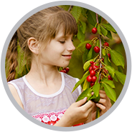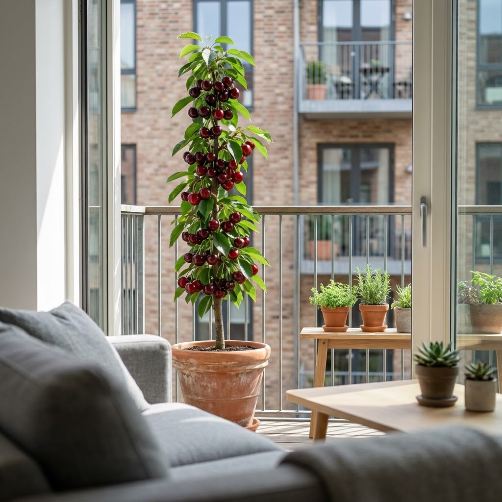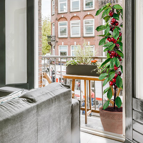 As nossas cerejas colunares "Burlat" produzem frutos vermelhos aromáticos e muito doces, adequados para consumo imediato e para fazer as suas compotas.