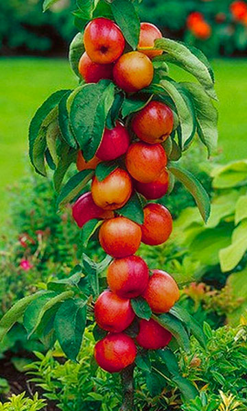Vantagens da árvore frutífera colunar: Como essas árvores requerem muito pouco espaço para viver, elas são plantadas densamente uma ao lado da outra, de modo que diversas variedades podem caber na mesma área. Combinar duas variedades diferentes em uma área para garantir uma boa polinização não é mais um problema! A árvore colunar pode ser cultivada em um recipiente grande e decorar uma varanda ou terraço. As flores e frutos de tamanho normal, crescendo muito densamente ao longo do tronco, vão decorar bem o local. Os primeiros frutos aparecem cedo: a primeira colheita ocorre um ano após o plantio da árvore, com os frutos crescendo na base do tronco. A poda para frutificação da árvore (ou seja, para aumentar a produtividade) é limitada ou completamente desnecessária.