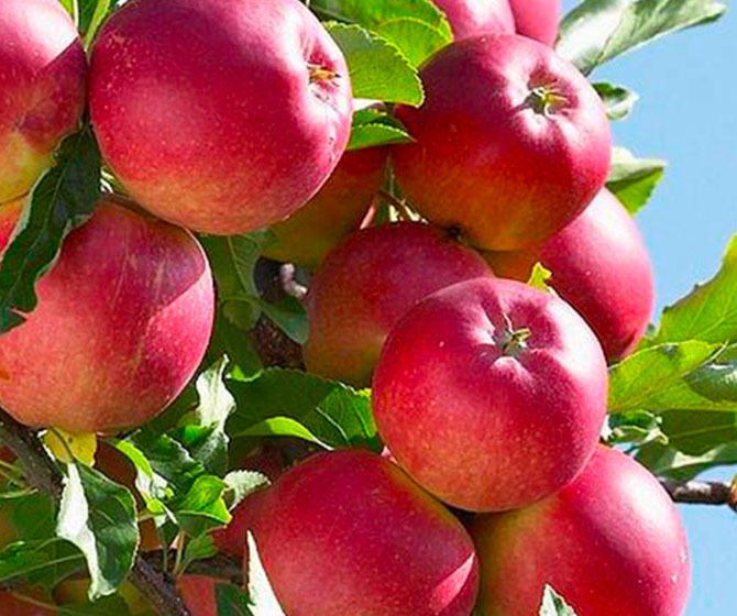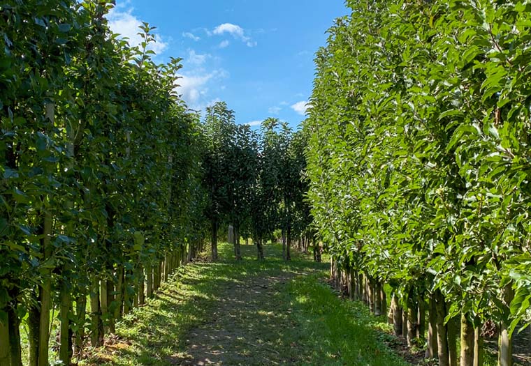 Árvores frutíferas colunares podem ser plantadas próximas umas das outras (0,5 a 1 metro de distância entre as árvores, 2 a 3 metros de distância entre fileiras de árvores).